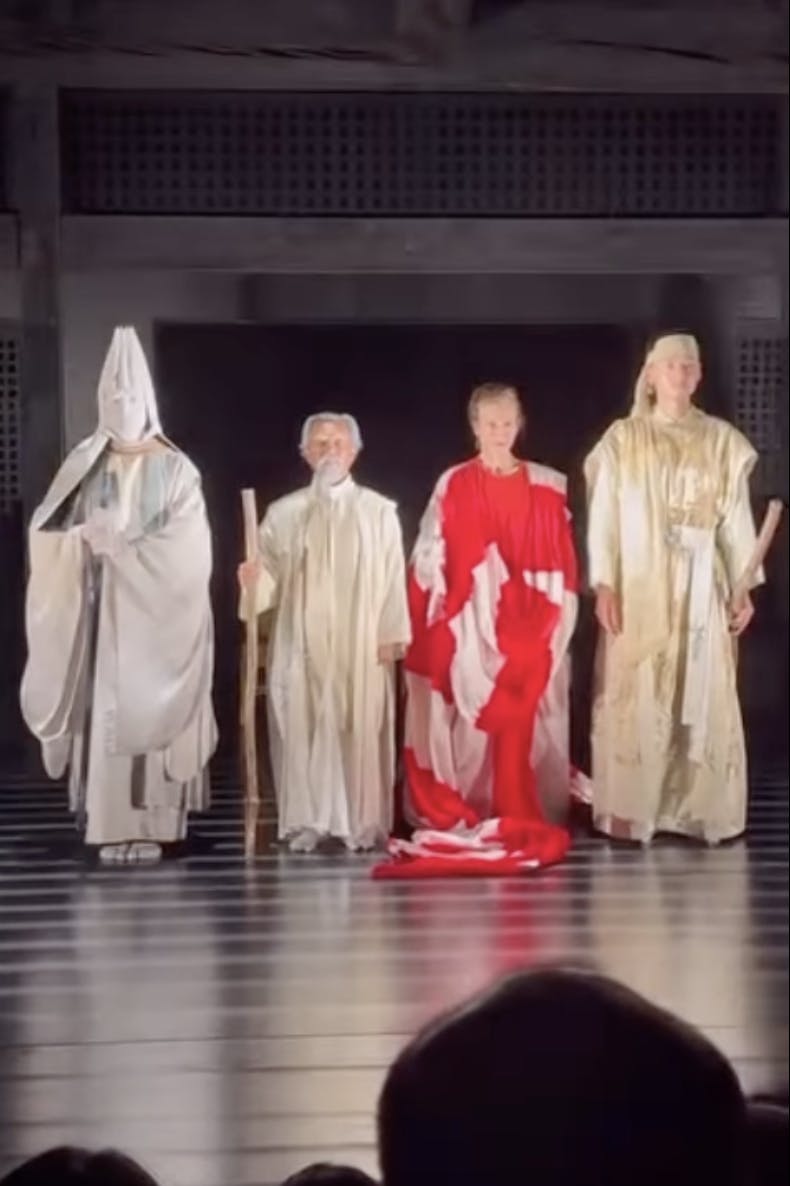 Sight lines were broken by the beams and upright pillars of the Toga theatre’s “praying hands” (gassho zukuri) architecture. Sometimes I could only hear a voice or see a fragment of each actor. Lighting beams shot through grill-bars breaking up the floor space into lines and grids, leaving lines of shadow on performers. This was a deep immersion for me, though I was sitting on a low step in a row of people, craning, trying to avoid blocking the view of people behind. I was disorientated but also wrapped up in the stage action.
