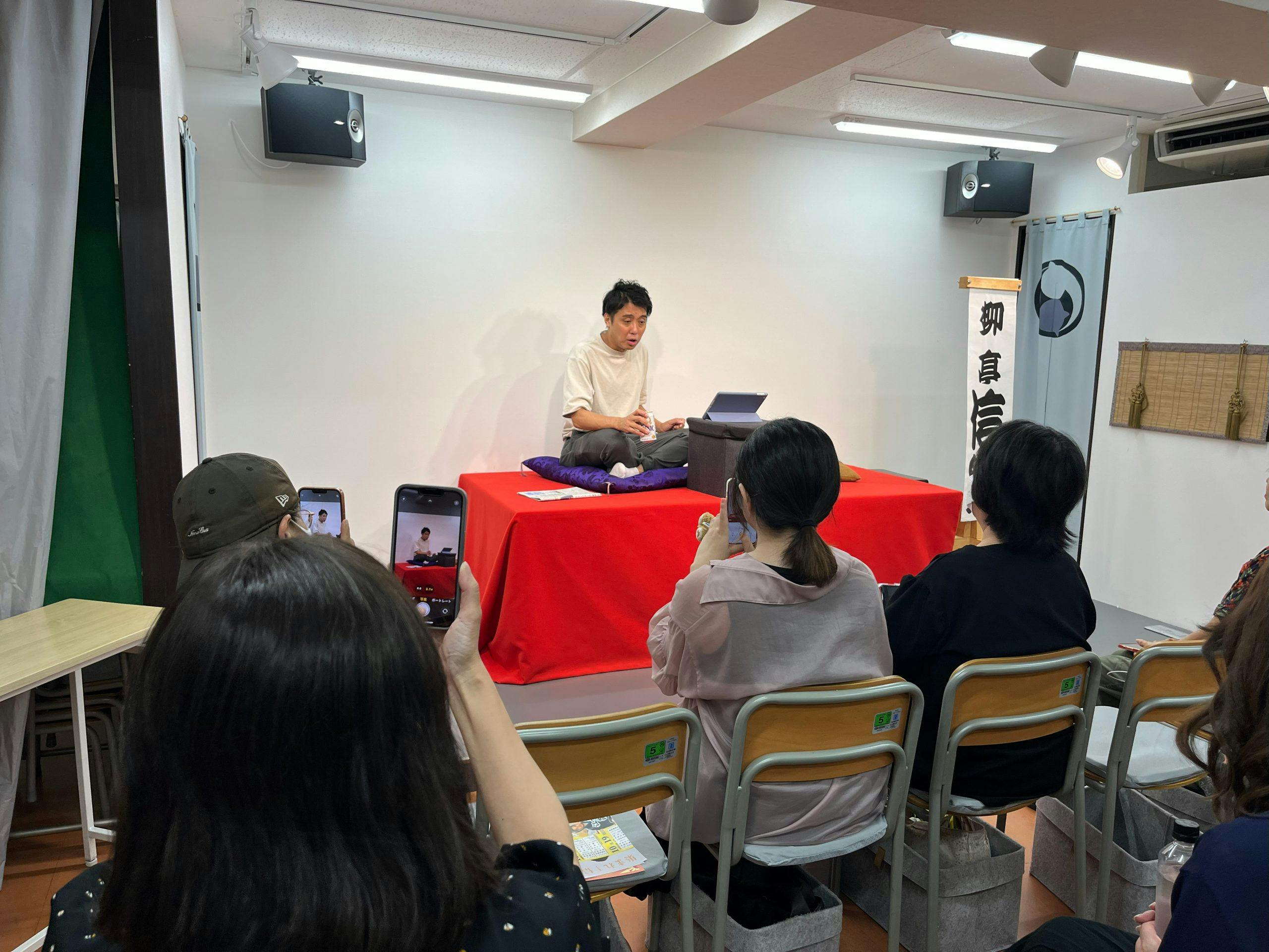 Rakugo involves a single storyteller kneeling on a cushion, elevated on a dais, offering their own take on classical stories determined by the season. The only props they are allowed are a collapsable fan (sensū) and a handkerchief (tenugui).